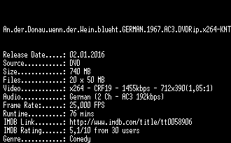 | FiLENAME: | An.der.Donau.wenn.der.Wein.blueht.GERMAN.1967.AC3.DVDRip.x264-KNT.mkv |