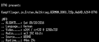 | FiLENAME: | Kampfflieger.im.Ersten.Weltkrieg.GERMAN.DOKU.720p.WebHD.h264-BTVG.mkv |