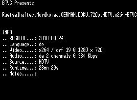 | FiLENAME: | Raetselhaftes.Nordkorea.GERMAN.DOKU.720p.HDTV.x264-BTVG.mkv |
