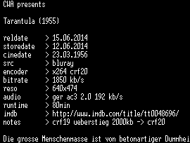 | FiLENAME: | Tarantula.1955.German.BDRip.x264.iNTERNAL-CWA.mkv |
