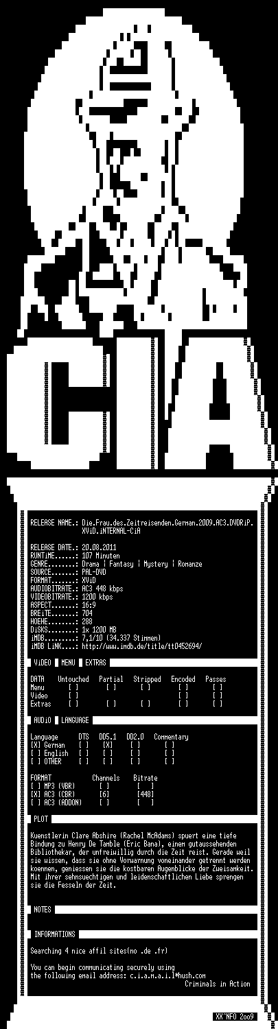 | FiLENAME: | Die.Frau.des.Zeitreisenden.German.2009.AC3.DVDRiP.XViD.iNTERNAL-CiA.avi |