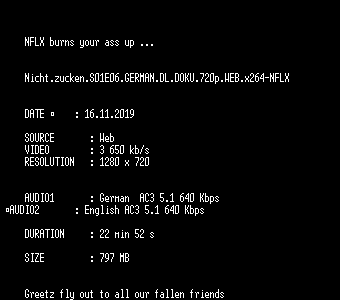 | FiLENAME: | Nicht.zucken.S01E06.GERMAN.DL.DOKU.720p.WEB.x264-NFLX.mkv |
