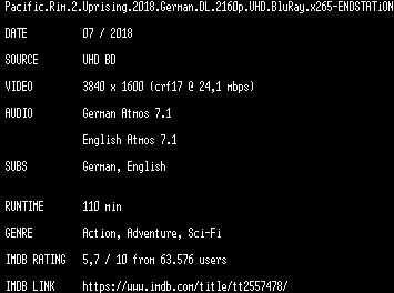 | FiLENAME: | Pacific.Rim.2.Uprising.2018.German.DL.2160p.UHD.BluRay.x265-ENDSTATiON.mkv |