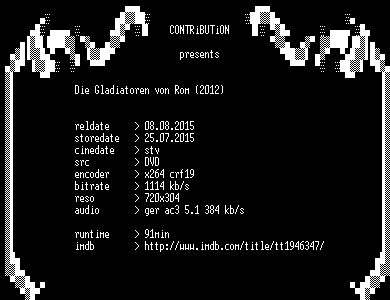 | FiLENAME: | Die.Gladiatoren.von.Rom.2012.German.DVDRip.x264-CONTRiBUTiON.mkv |