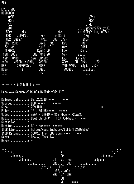 | FiLENAME: | LenaLove.German.2016.AC3.DVDRiP.x264-KNT.mkv |