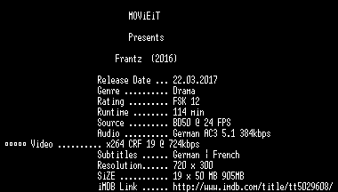 | FiLENAME: | Frantz.German.2016.AC3.BDRip.x264-MOViEiT.mkv |