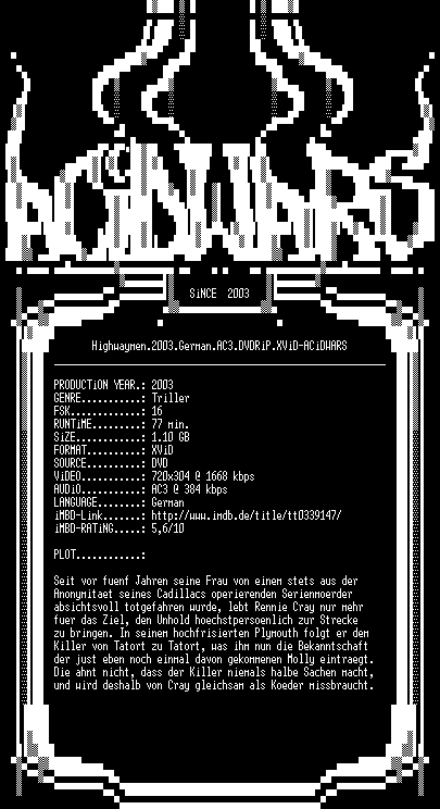| FiLENAME: | Highwaymen.2003.German.AC3.DVDRiP.XViD-ACiDWARS.avi |