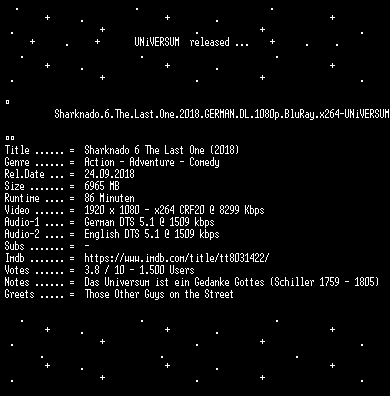| FiLENAME: | Sharknado.6.The.Last.One.2018.GERMAN.DL.1080p.BluRay.x264-UNiVERSUM.mkv |