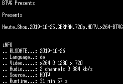 | FiLENAME: | Heute.Show.2019-10-25.GERMAN.720p.HDTV.x264-BTVG.mkv |