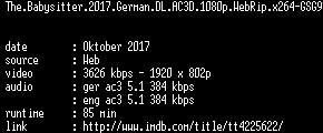 | FiLENAME: | The.Babysitter.2017.German.DL.AC3D.1080p.WebRip.x264-GSG9.mkv |
