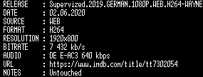 | FiLENAME: | Supervized.2019.GERMAN.1080P.WEB.H264-WAYNE.mkv |