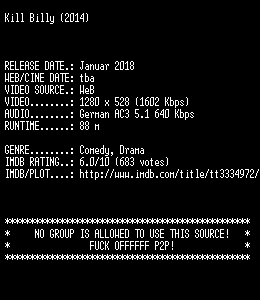 | FiLENAME: | Kill.Billy.2014.German.720p.WebHD.x264-SLG.mkv |
