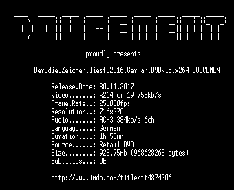 | FiLENAME: | Der.die.Zeichen.liest.2016.German.DVDRip.x264-DOUCEMENT.mkv |