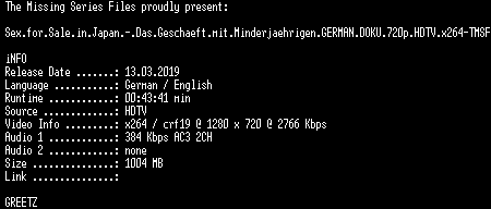 | FiLENAME: | Sex.for.Sale.in.Japan.-.Das.Geschaeft.mit.Minderjaehrigen.GERMAN.DOKU.720p.HDTV.x264-TMSF.mkv |