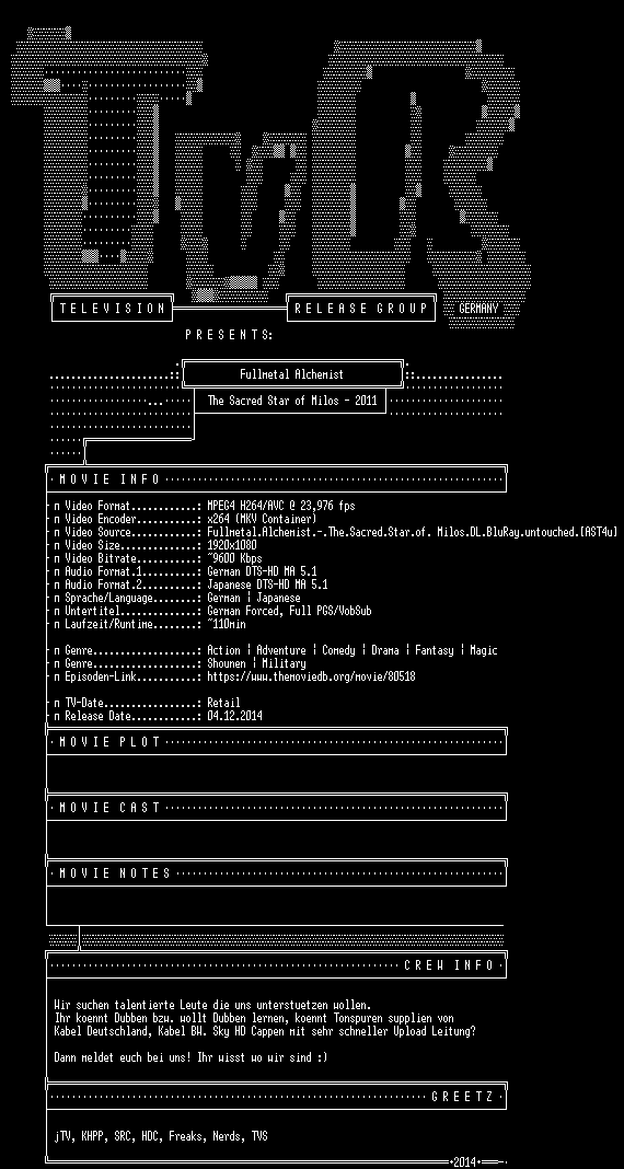 | FiLENAME: | Fullmetal.Alchemist.The.Sacred.Star.of.Milos.GERMAN.5.1.DL.DTSMA.ANiME.BDRiP.1080p.WS.x264-TvR.mkv |