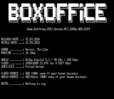 | FiLENAME: | Keep.Watching.2017.German.AC3.1080p.WEB.h264-BOXOFFiCE.mkv |