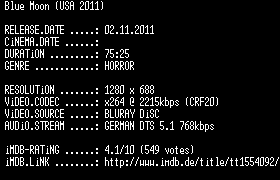 | FiLENAME: | Blue.Moon.Als.Werwolf.geboren.2011.German.720p.BluRay.x264-PRiViLEGED.mkv |