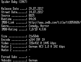 | FiLENAME: | Spider.Baby.German.REMASTERED.1967.AC3.BDRip.x264-SPiCY.mkv |