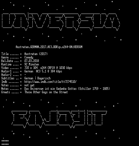| FiLENAME: | Austreten.GERMAN.2017.AC3.BDRip.x264-UNiVERSUM.mkv |