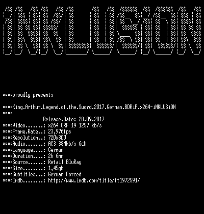 | FiLENAME: | King.Arthur.Legend.of.the.Sword.2017.German.BDRiP.x264-iNKLUSiON.mkv |
