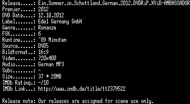 | FiLENAME: | Ein.Sommer.in.Schottland.German.2012.DVDRiP.XViD-AMBASSADOR.avi |