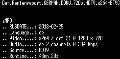 | FiLENAME: | Der.Rentenreport.GERMAN.DOKU.720p.HDTV.x264-BTVG.mkv |