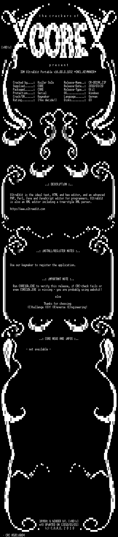 | FiLENAME: | IDM.UltraEdit.Portable.v16.00.0.1032.German.Incl.Keymaker-CORE.rar |