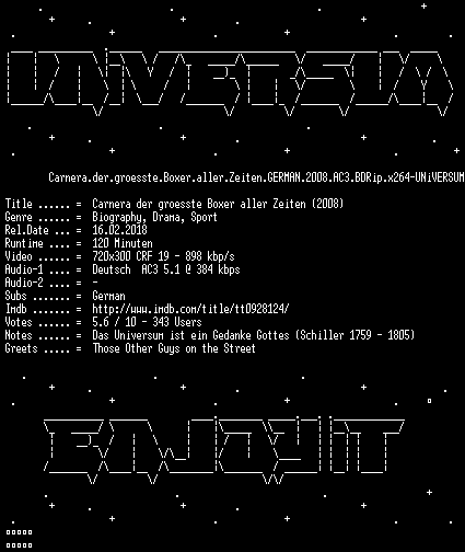 | FiLENAME: | Carnera.der.groesste.Boxer.aller.Zeiten.GERMAN.2008.AC3.BDRip.x264-UNiVERSUM.mkv |