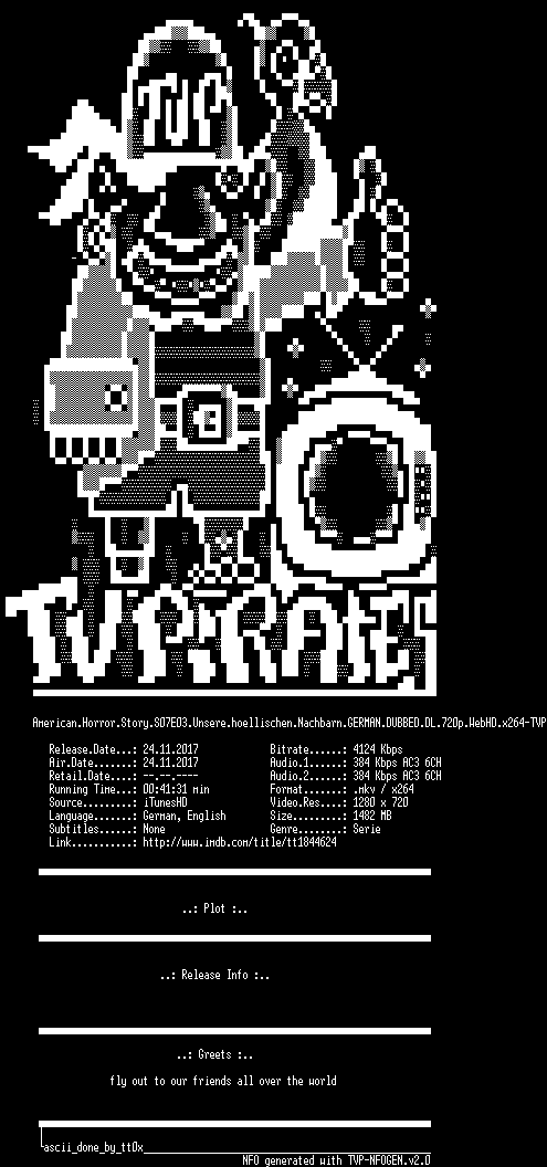 | FiLENAME: | American.Horror.Story.S07E03.Unsere.hoellischen.Nachbarn.GERMAN.DUBBED.DL.720p.WebHD.x264-TVP.mkv |