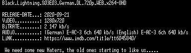 | FiLENAME: | Black.Lightning.S03E03.German.DL.720p.WEB.x264-OHD.mkv |