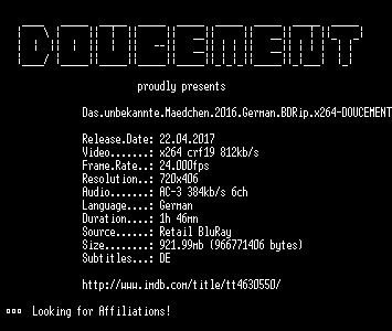 | FiLENAME: | Das.unbekannte.Maedchen.2016.German.BDRip.x264-DOUCEMENT.mkv |