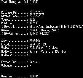 | FiLENAME: | That.Thing.You.Do.German.REMASTERED.1996.EXTENDED.AC3.BDRip.x264-SPiCY.mkv |