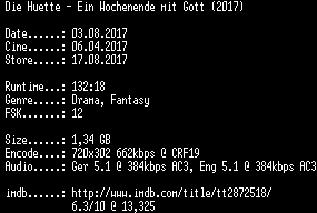 | FiLENAME: | Die.Huette.-.Ein.Wochenende.mit.Gott.German.2017.DL.BDRiP.x264-CiNEViSiON.mkv |