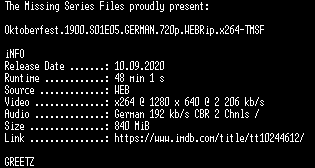 | FiLENAME: | Oktoberfest.1900.S01E05.GERMAN.720p.WEBRip.x264-TMSF.mkv |