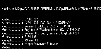 | FiLENAME: | Locke.and.Key.2020.S01E05.GERMAN.DL.1080p.WEB.x264.iNTERNAL-EiSBOCK.mkv |