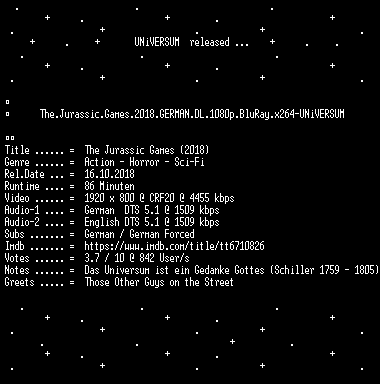 | FiLENAME: | The.Jurassic.Games.2018.GERMAN.DL.1080p.BluRay.x264-UNiVERSUM.mkv |