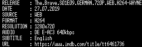 | FiLENAME: | The.Brave.S01E09.GERMAN.720P.WEB.H264-WAYNE.mkv |