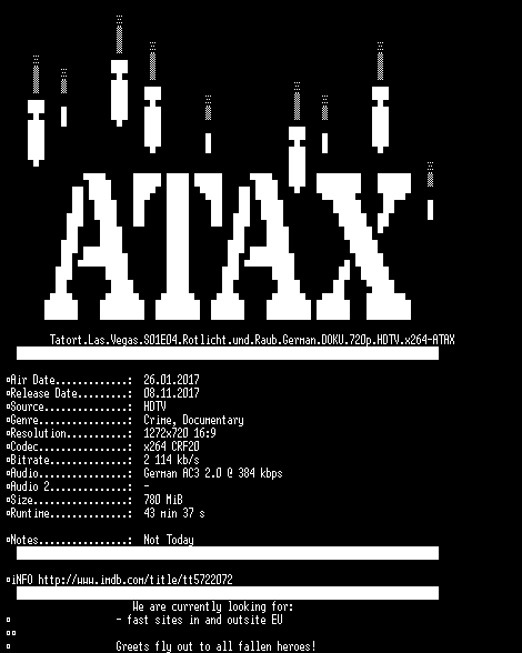 | FiLENAME: | Tatort.Las.Vegas.S01E04.Rotlicht.und.Raub.German.DOKU.720p.HDTV.x264-ATAX.mkv |