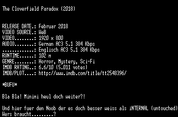 | FiLENAME: | The.Cloverfield.Paradox.2018.German.DL.1080p.WebHD.x264.iNTERNAL-SLG.mkv |