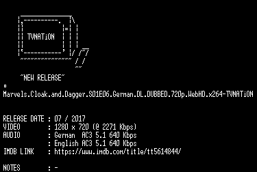 | FiLENAME: | Marvels.Cloak.and.Dagger.S01E06.German.DL.DUBBED.720p.WebHD.x264-TVNATiON.mkv |