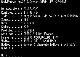 | FiLENAME: | Bad.Education.2019.German.1080p.WEB.h264-WvF.mkv |