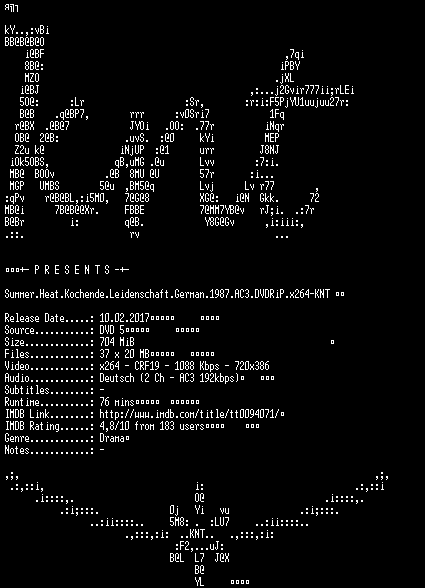 | FiLENAME: | Summer.Heat.Kochende.Leidenschaft.German.1987.AC3.DVDRiP.x264-KNT.mkv |