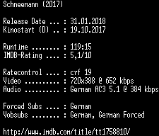 | FiLENAME: | Schneemann.German.2017.AC3.BDRip.x264-COiNCiDENCE.mkv |