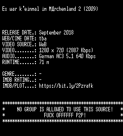 | FiLENAME: | Es.war.keinmal.im.Maerchenland.2.2009.German.720p.WebHD.x264-SLG.mkv |