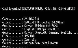| FiLENAME: | Castlevania.S02E08.GERMAN.DL.720p.WEB.x264-EiSBOCK.mkv |