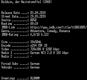 | FiLENAME: | Balduin.der.Heiratsmuffel.German.1968.AC3.BDRiP.x264.iNTERNAL-SPiCY.mkv |