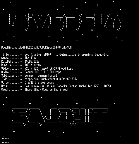 | FiLENAME: | Boy.Missing.GERMAN.2016.AC3.BDRip.x264-UNiVERSUM.mkv |