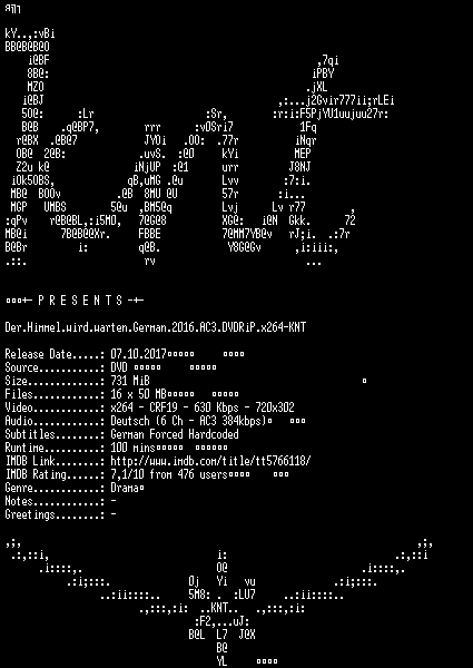 | FiLENAME: | Der.Himmel.wird.warten.German.2016.AC3.DVDRiP.x264-KNT.mkv |