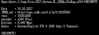 | FiLENAME: | Open.Water.3.Cage.Dive.2017.German.DL.1080p.BluRay.x264-CHECKMATE.mkv |