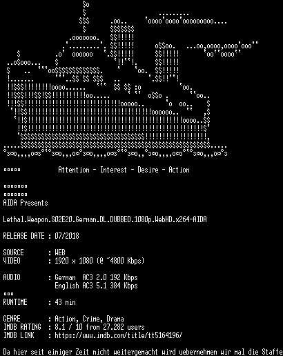 | FiLENAME: | Lethal.Weapon.S02E20.German.DL.DUBBED.1080p.WebHD.x264-AIDA.mkv |